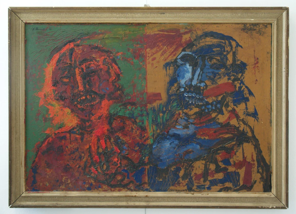 Výrazné expresivní dílo s námětem inkvizitora, symbolicky ztvárněného v konfrontaci dvou protikladných postav. Pravá postava s modrým zabarvením a chladným výrazem je vizuálně spojena s tematikou moci, nátlaku a dohledu – označená přímo jako „Inkvizitor“. Levá, rudě a oranžově laděná figura působí živěji a emotivněji, snad jako oběť nebo protiklad autority. Typická Zavadilova malířská gesta. Silná pastózní struktura, kontrastní barvy a syrový výraz dodávají obrazu dramatickou hloubku i psychologické napětí.